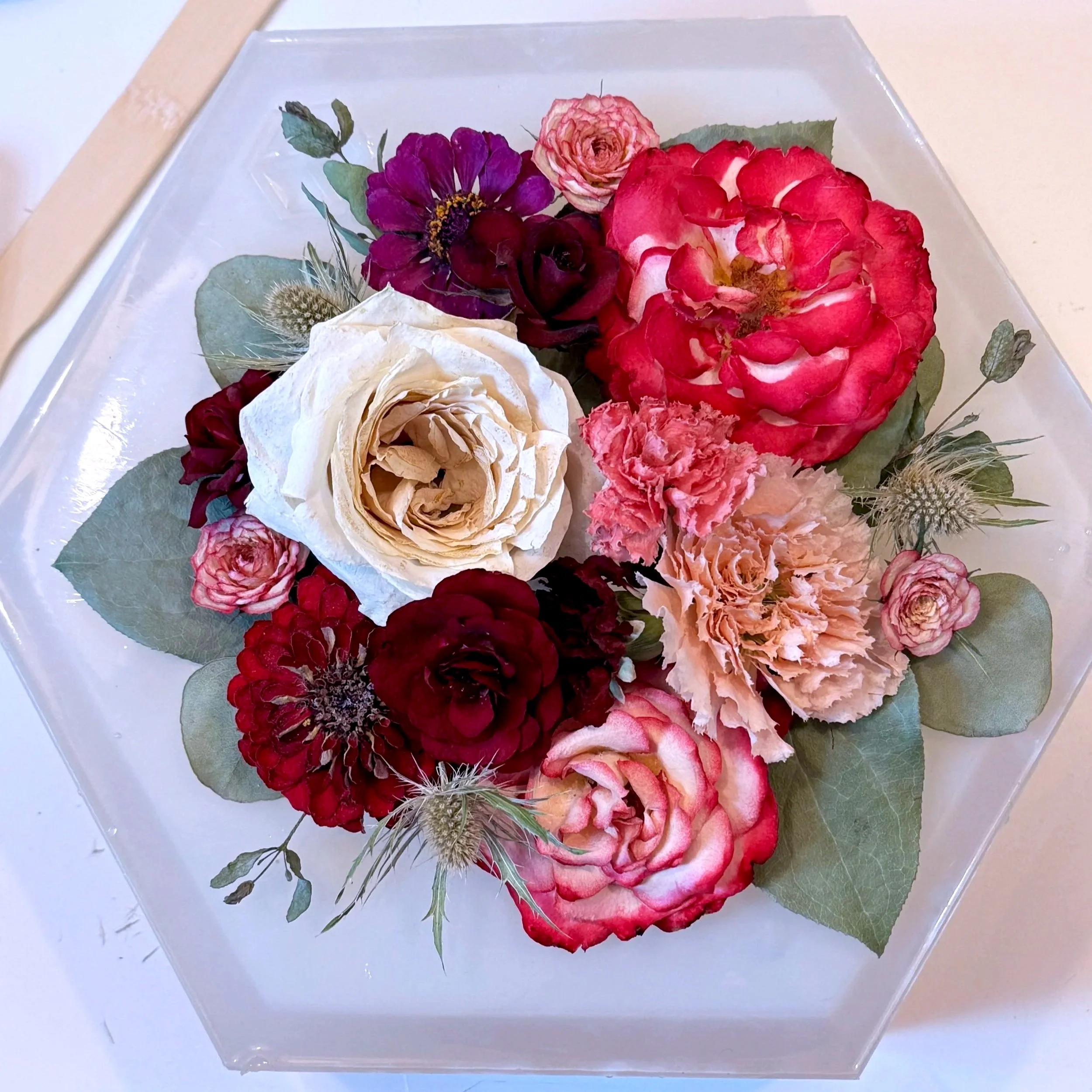 Once your flowers are removed from the Silica, you will be emailed a picture of the dried flowers. We can discuss colour correction if this service is wanted due to any discoloration of the dried flowers. Be My Resin will then send mock-up images for your design input. Everyone has a different design aesthetic, so please let us know at this point if you would like a change to the layout! We want your experience with Be My Resin to be easy and fun. All efforts to change the flowers to your preferred layout will be made. Please be aware that there is a possibility of slight flower migration when the resin is added.